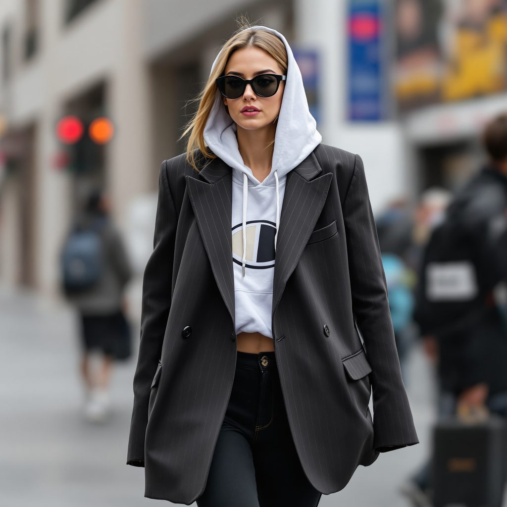 Most real outfits live in the messy middle. You might wear a sharp bodysuit with slouchy joggers, or throw a blazer over your favorite hoodie. You might pair a silky skirt with an ancient sweatshirt that knows too many of your secrets. Your style is already telling the truth: you contain multitudes.