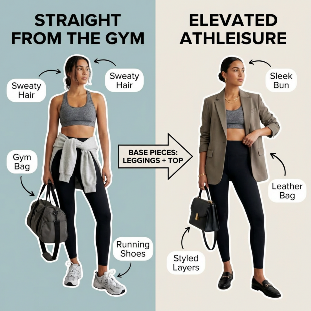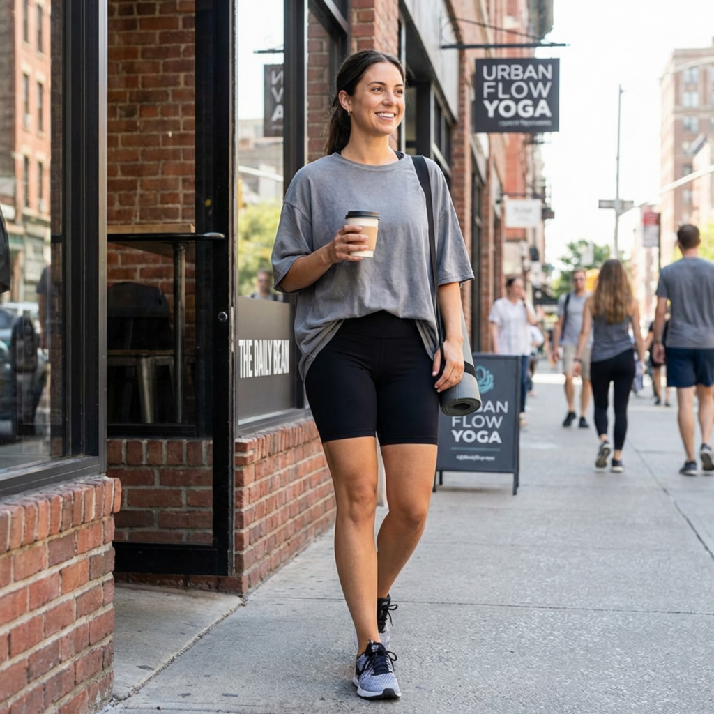Here is the easiest way to do this in real life. Start with one activewear piece, add one relaxed piece, add one structured piece, then finish with accessories that do not scream locker room. That is it. Leggings, tee, trench. Track pants, fitted tank, blazer. Biker shorts, oversized button-down, sleek sneakers. Flared yoga pants, zip jacket, sharp tote. The formula works because it lets the sporty item be part of the outfit instead of the entire identity crisis.