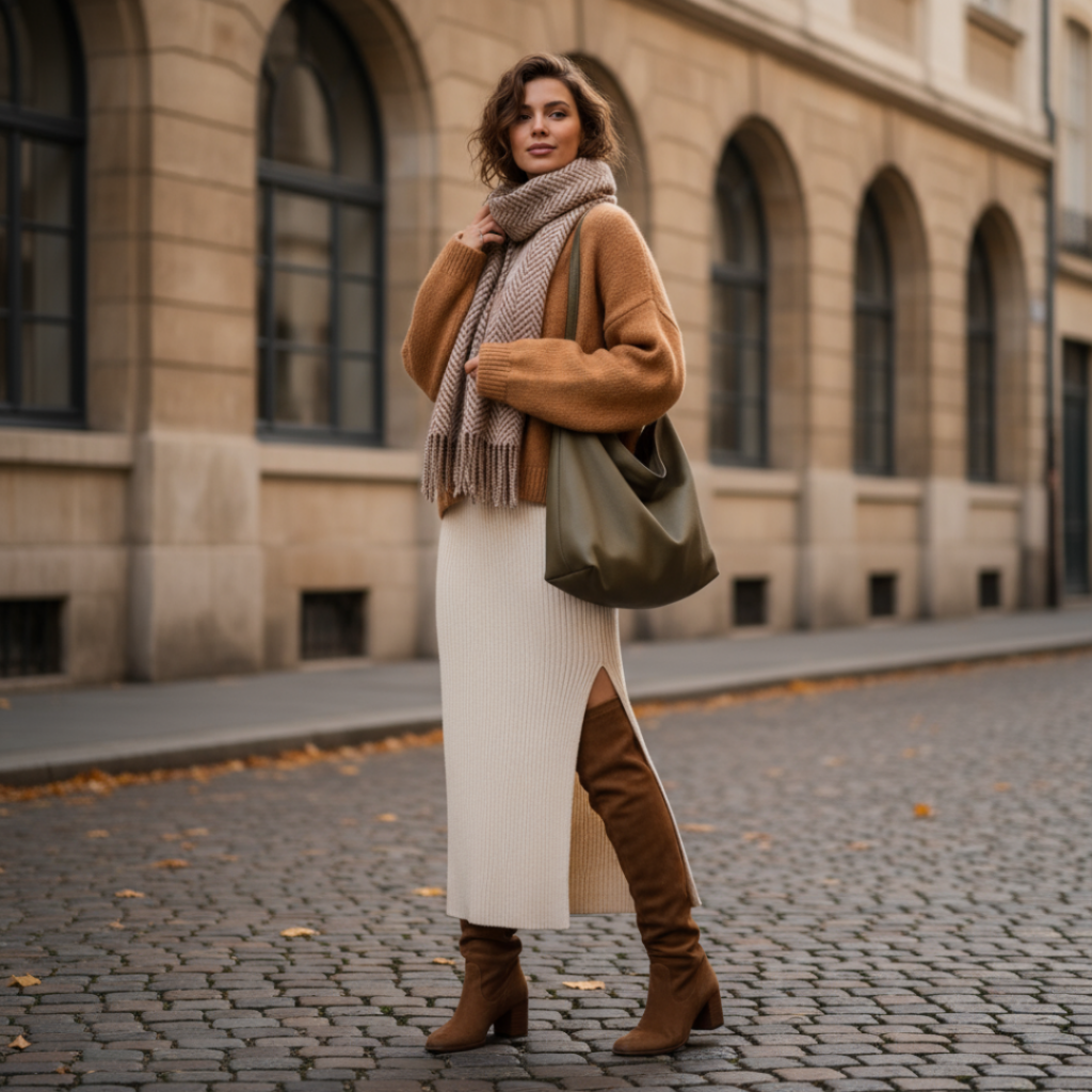 This season’s maxi isn’t just about length, it’s about fabric that screams luxury. Velvet is leading the charge (rich jewel tones that photograph like a dream). Thick ribbed knits are making maxis cozy enough for daily wear. Even satin and silk maxis are layered under chunky sweaters or oversized coats for that delicious contrast of fragility and armor. And let’s not forget leather structured maxi skirts are here for the rebels who want elegance with an edge.