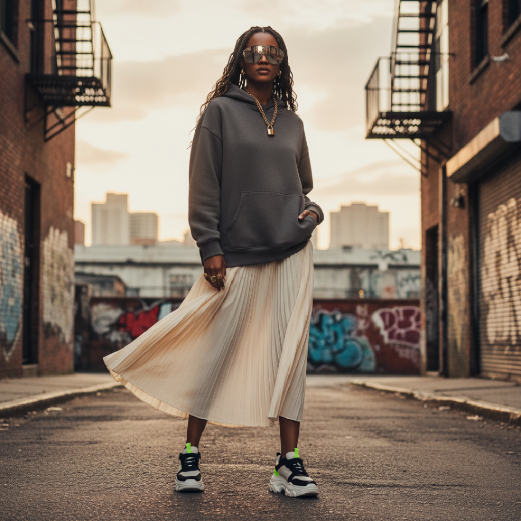 Here’s the fun part: maxis aren’t just for gala vibes. Streetwear is mixing in maxis with sneakers, hoodies, and bomber jackets. A pleated maxi skirt with a cropped hoodie? Effortlessly cool. A velvet maxi paired with chunky boots and a puffer coat. High fashion meets street-level rebellion. The mashup proves that maxis aren’t fragile they’re adaptable.