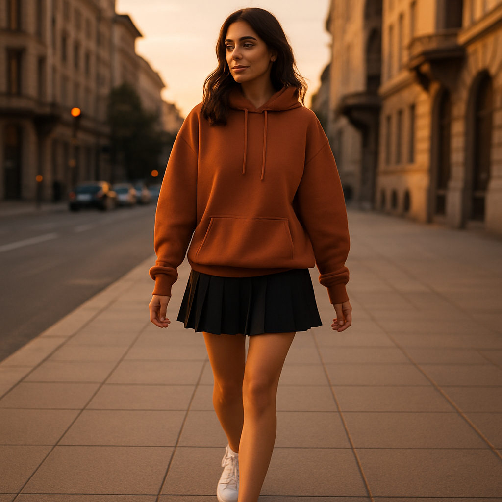 Streetwear has fully claimed the mini this season. Think pleated minis styled with hoodies and sneakers, or bodycon minis layered under oversized bomber jackets. The vibe is playful yet powerful soft femininity with a tough, urban edge. A mini skirt with chunky sneakers and an oversized hoodie? That’s the 2025 remix of “off-duty model.”