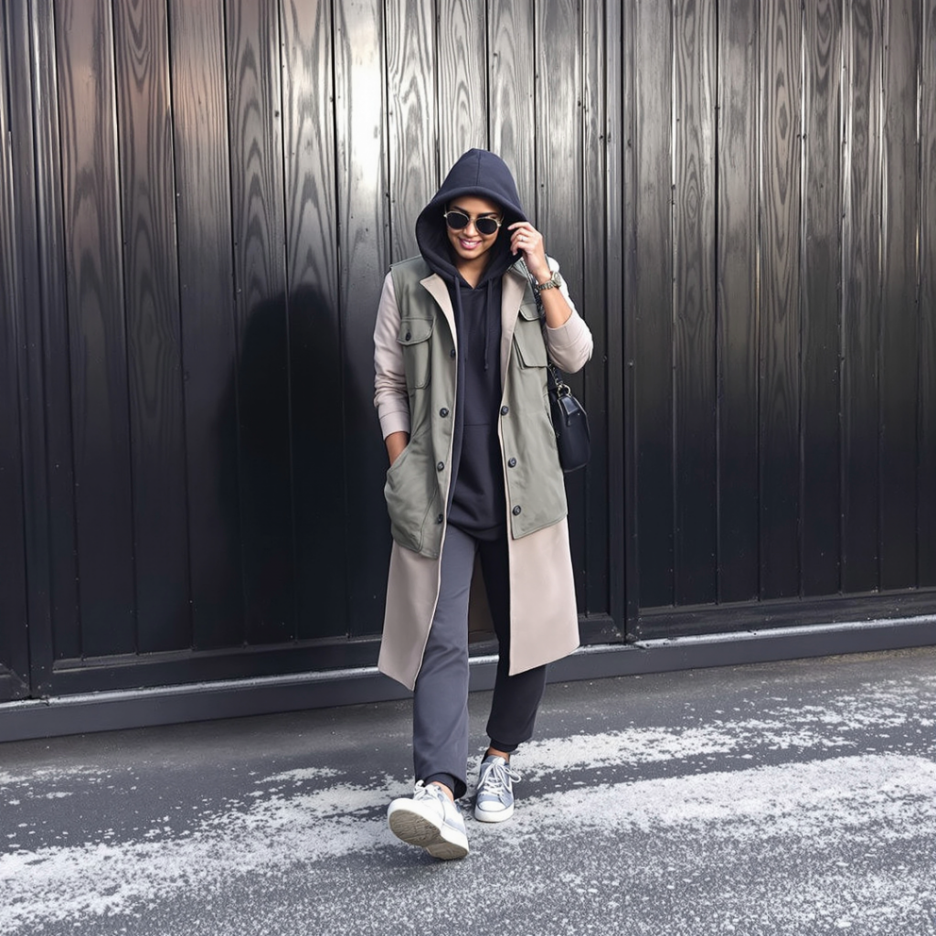 Now, if you’re thinking luxe layering sounds too bougie for the block, let me remind you: streetwear has already claimed it. We’re seeing utility vests over hoodies under tailored coats, cargo pants layered with thermal leggings, and sneakers anchoring the whole thing, so you don’t look like you’re en route to a country club. Luxe layering thrives on contrast pairing an elegant piece with something unapologetically urban.