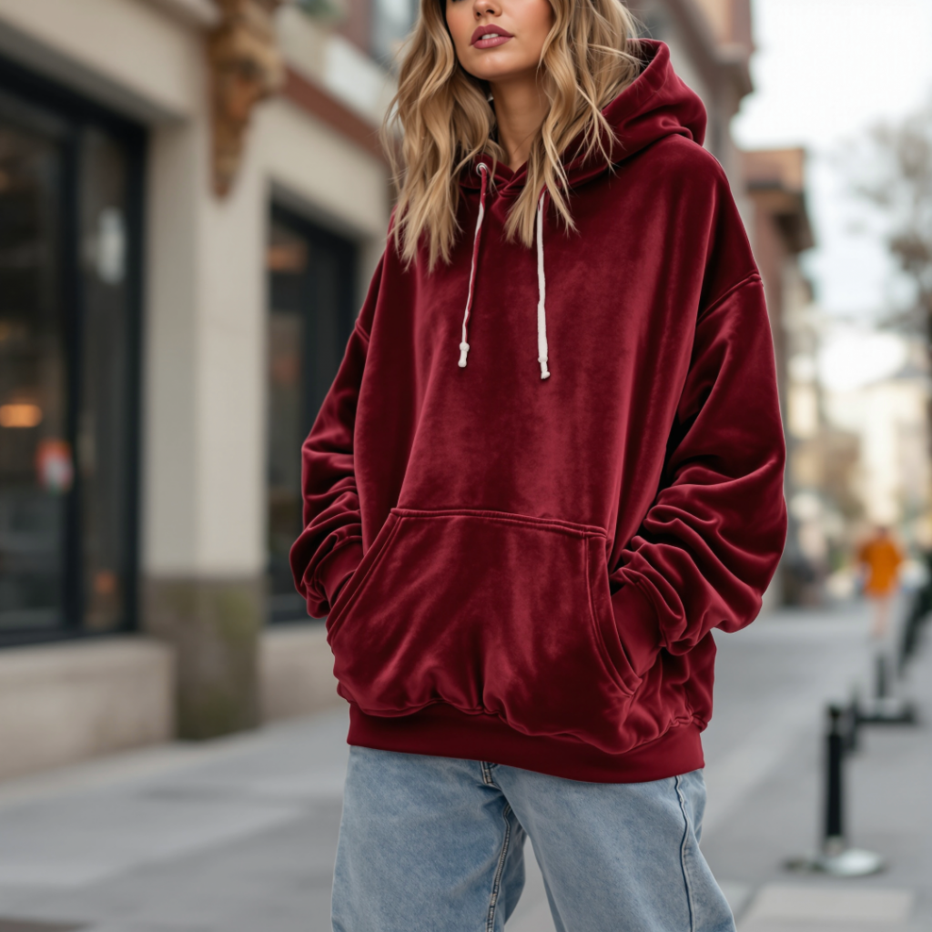 Now before you think velvet is only for holiday parties and opera tickets, let’s set the record straight. Streetwear has officially claimed velvet. We’re talking oversized velvet hoodies, slouchy velvet trousers, even sneakers trimmed with the stuff. Picture a cropped velvet hoodie with baggy jeans and chunky sneakers. That’s not just fashion—it’s rebellion wrapped in softness.